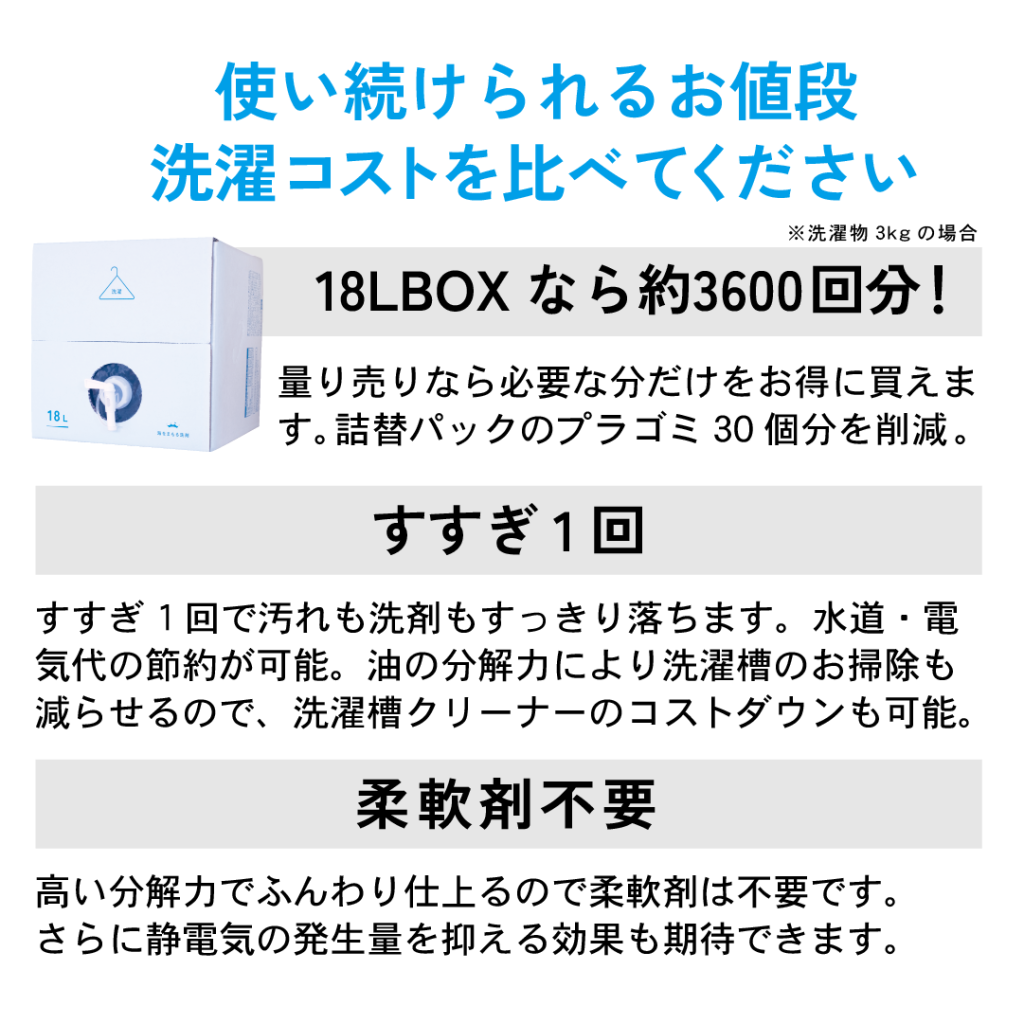 一回あたりの値段が安く、すすぎ1回で柔軟剤も不要。お財布と地球に優しいことが特徴です。